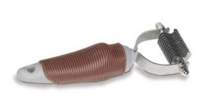 Een andere manier is het werken met de Coat King, een klittenhark die de klit niet echt doorsnijdt maar met elke (rustige) beweging de bovenste laag los “schaaft”.