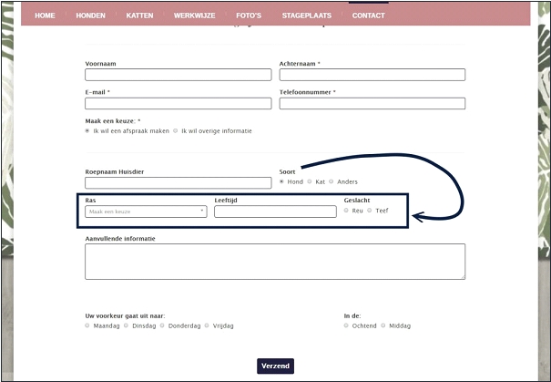 Het contactformulier dat op mijn website staat lijkt in eerste instantie eenvoudig, maar klikt de bezoeker op de optie “Ik wil een afspraak maken” dan verschijnt er een aantal extra velden waarmee ik gelijk de meest belangrijke informatie over het huisdier heb om daadwerkelijk een afspraak in te plannen.