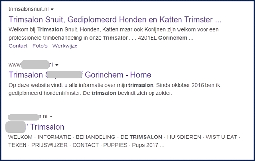 De tekst van de collega-trimsters die getoond wordt is automatisch door Google van hun website gepakt en dat is niet altijd de beste tekst.