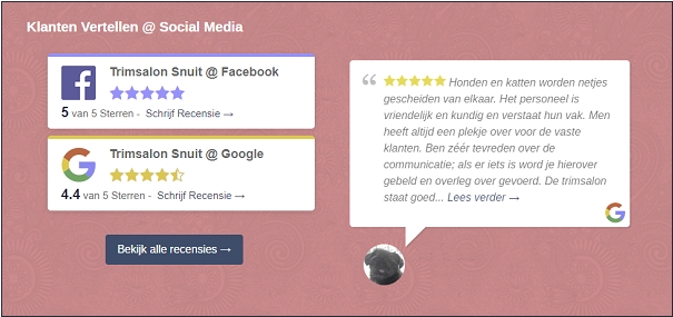 Onze websitebouwer heeft hiervoor een module ingebouwd welke automatisch de recensies van Google en Facebook haalt en deze op de website toont: