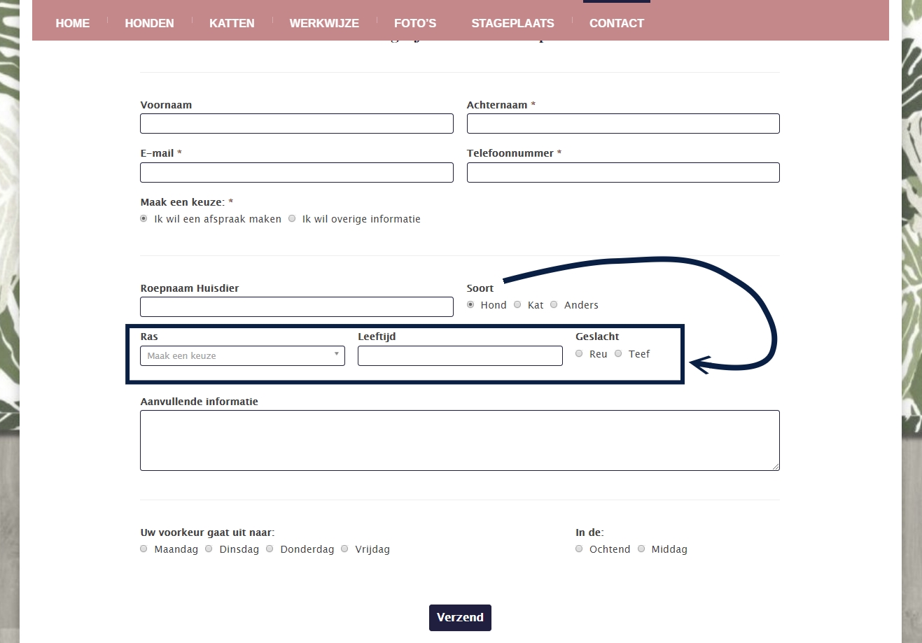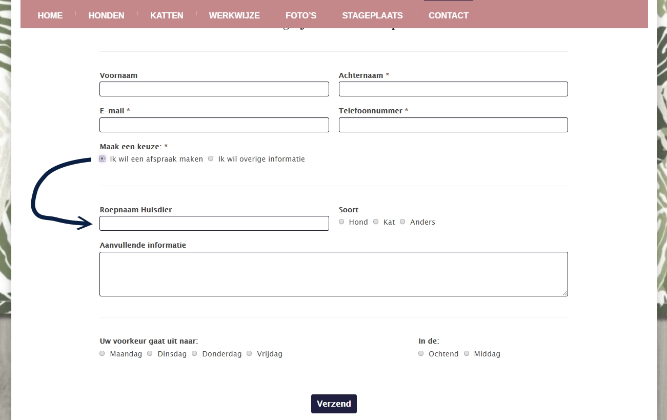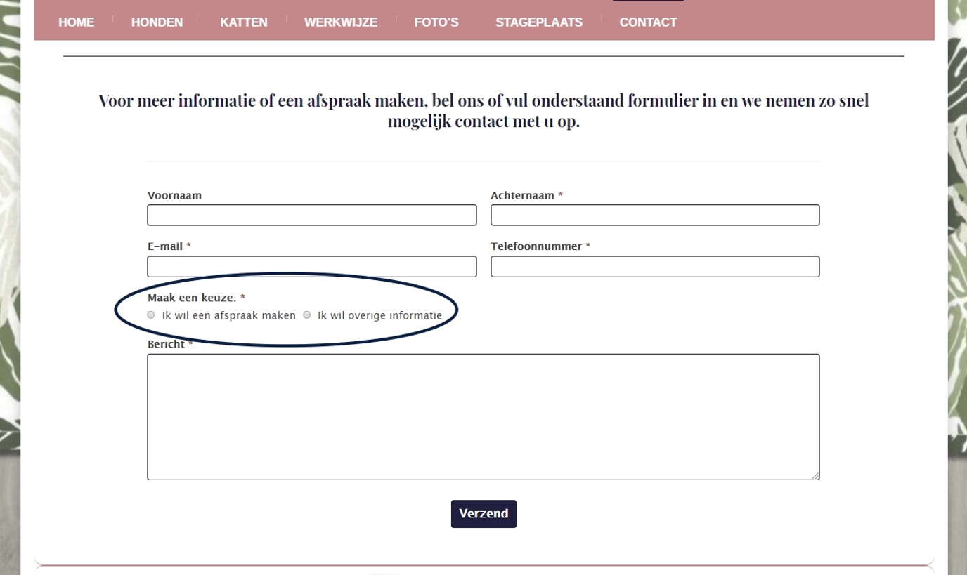 Ons eerste contactformulier was eenvoudig opgezet met velden als naam, telefoonnummer en een berichtveld. Dit formulier hebben we aangepast waardoor we nu ook informatie krijgen over het huisdier zodat we goed voorbereid de klant kunnen benaderen om daadwerkelijk een afspraak in te plannen.