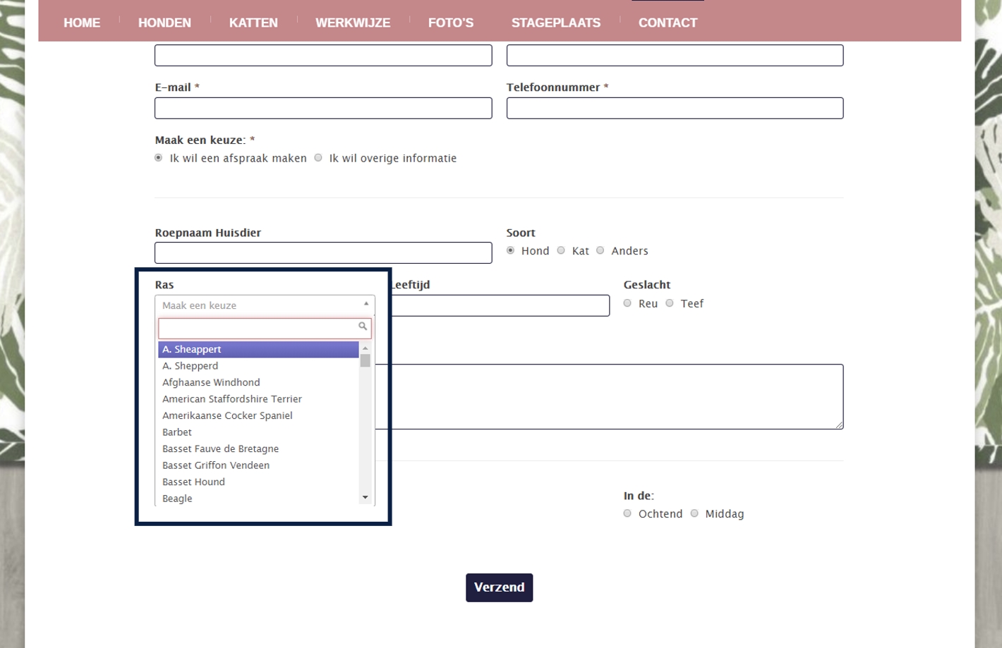En om het de klant makkelijk te maken zijn alle honden (en katten) -rassen eenvoudig te kiezen. Als laatste optie in het formulier kan de klant nog een voorkeur aangeven voor de dag waarop de klant de afspraak zou willen hebben.